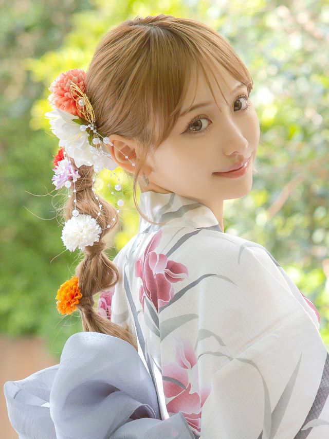 3. [浴衣小物] 髪飾り パール垂れ付きダリア×マム浴衣ヘアアクセサリー8点セット(オフホワイト/ピンク)