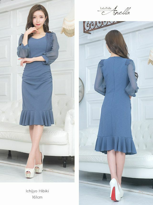 キャバドレス Anella アネラ レース ふんわりシアー 袖あり ギャザー 裾フリル 膝丈 タイト 韓国ドレス
