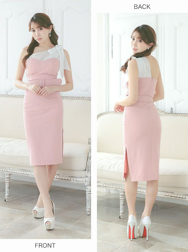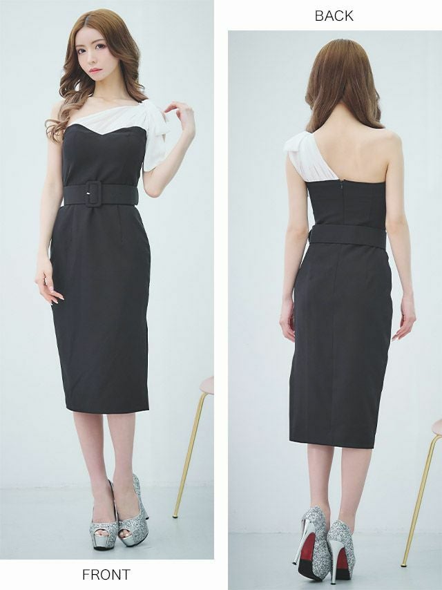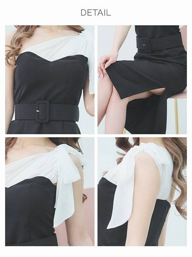 Anella アネラ バイカラーワンショルダーリボンウエストベルトデザイン膝丈タイト韓国ドレス (Sサイズ~Lサイズ) (一条響 キャバ韓国ドレス着用)