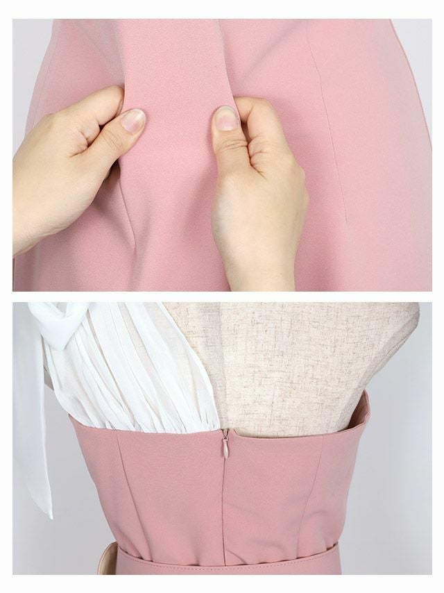 バイカラーワンショルダーリボンウエストベルトデザイン膝丈タイトドレスのカラーバリエーション