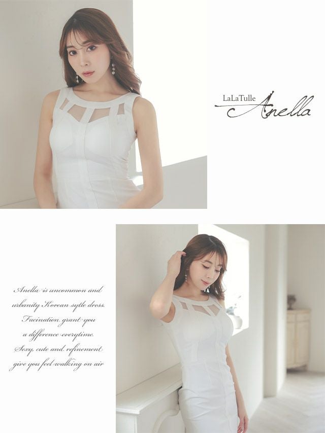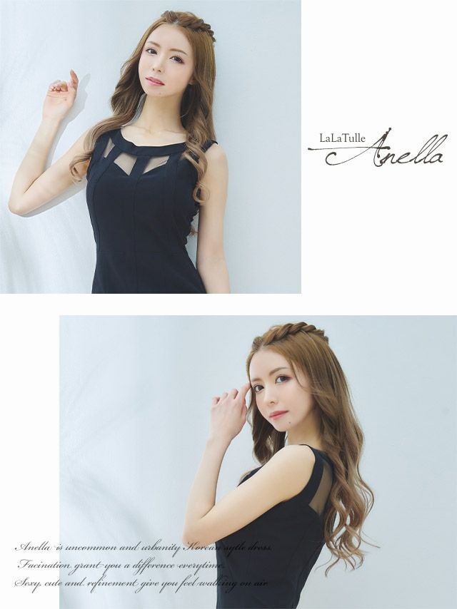 Anella アネラ デコルテシースルーワンカラーノースリーブ膝丈タイト韓国ドレス (Sサイズ~Lサイズ) (森咲智美 キャバ韓国ドレス着用)