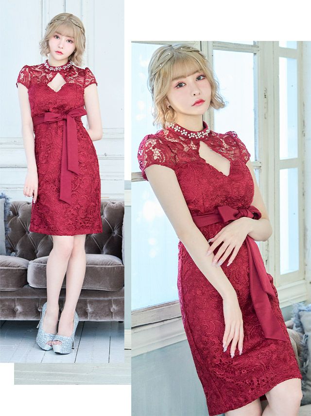 キラキラハイネックビジューバストカットウエストリボン付き半袖ケミカル総レース膝丈タイトドレスのカラーバリエーション