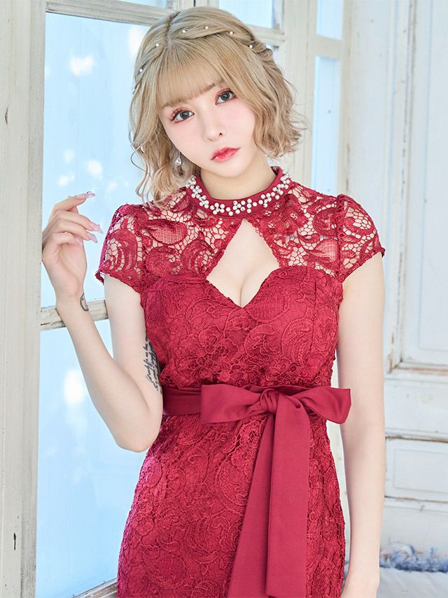 3. キラキラハイネック ビジュー バストカット ウエストリボン付き 半袖 ケミカル 総レース タイト 谷間魅せ 膝丈ドレス (Sサイズ~XLサイズ) (ゆんころ/キャバドレス着用)