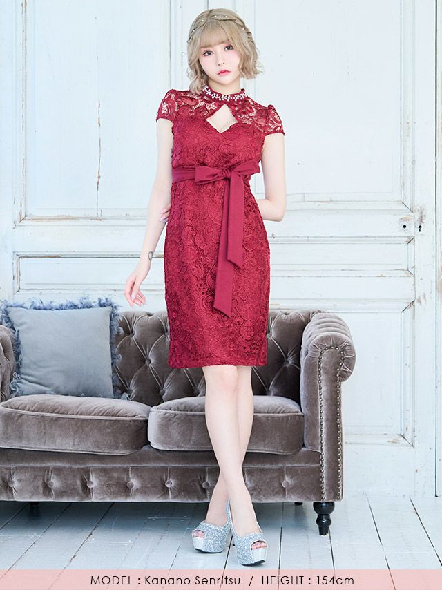 5. キラキラハイネック ビジュー バストカット ウエストリボン付き 半袖 ケミカル 総レース タイト 谷間魅せ 膝丈ドレス (Sサイズ~XLサイズ) (ゆんころ/キャバドレス着用)