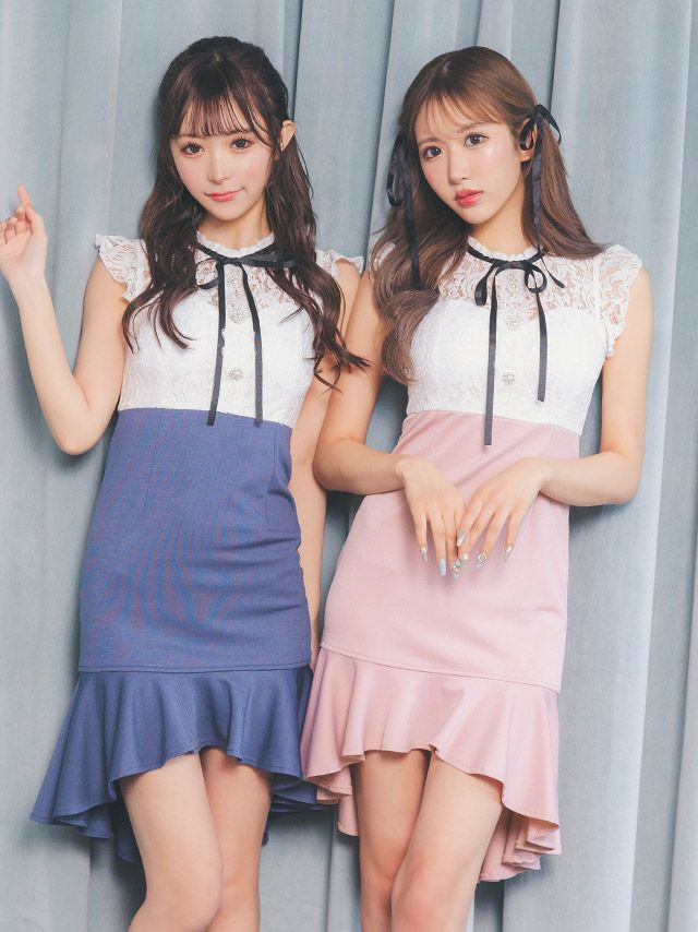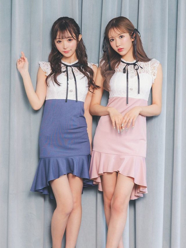 ネックリボンホワイトレースウエスト切替ノースリーブ裾フリルテールタイトミニドレスのカラーバリエーション