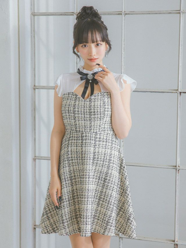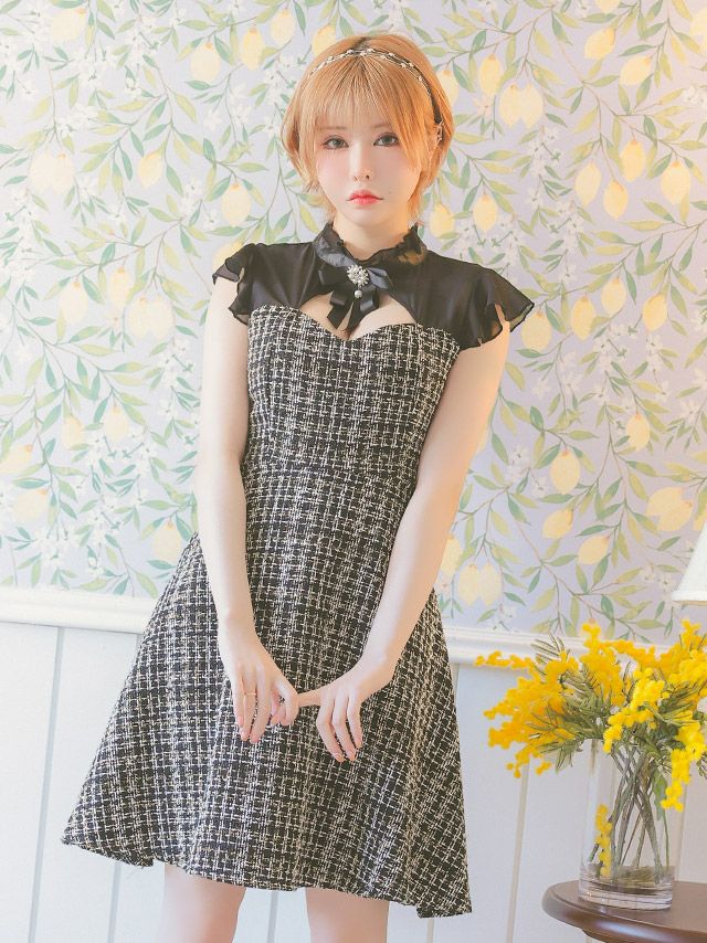 3. [SALE] ネックリボン ノースリーブ シアー フリル袖 バストカット ツイード チェック柄 Aライン 谷間魅せ 膝丈ドレス (Sサイズ~XLサイズ) (重川茉弥/キャバドレス着用)