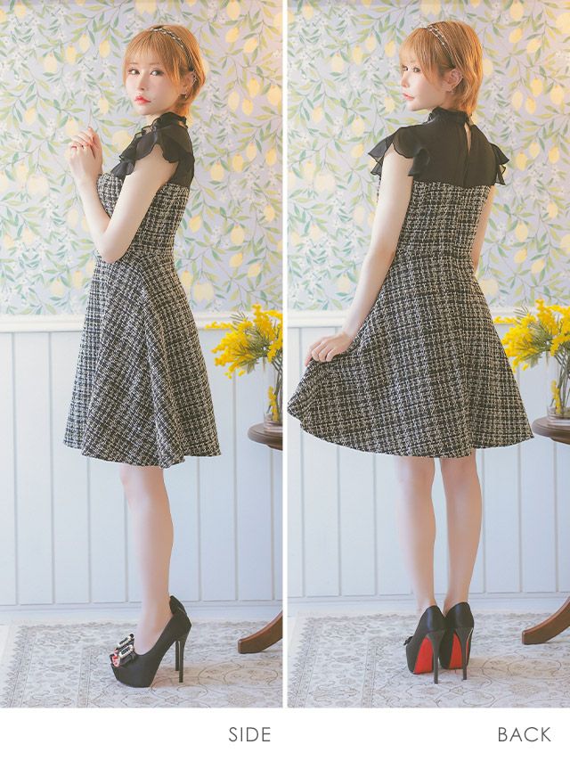 4. [SALE] ネックリボン ノースリーブ シアー フリル袖 バストカット ツイード チェック柄 Aライン 谷間魅せ 膝丈ドレス (Sサイズ~XLサイズ) (重川茉弥/キャバドレス着用)