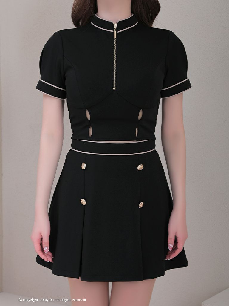 韓国っぽお姉さんセットアップデザイン☆ [AndyGLAMOROUS/アンディグラマラス] 高級セットアップ フロントジップ バイカラー 半袖 フレアミニドレス