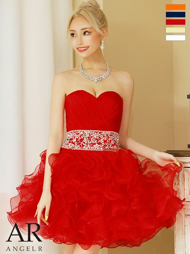 足長効果と引き締め効果を合わせもつ☆ [Angel-R/エンジェルアール] 高級ウエストビジューフリルバックレースアップベアトップフレアミニドレス