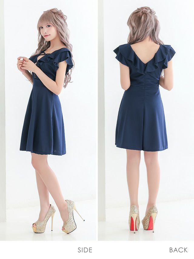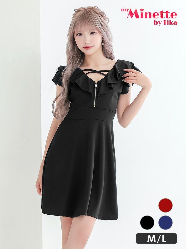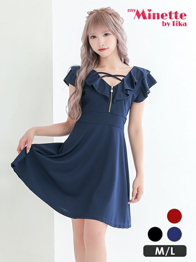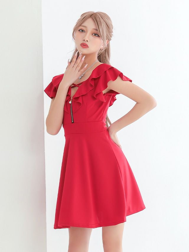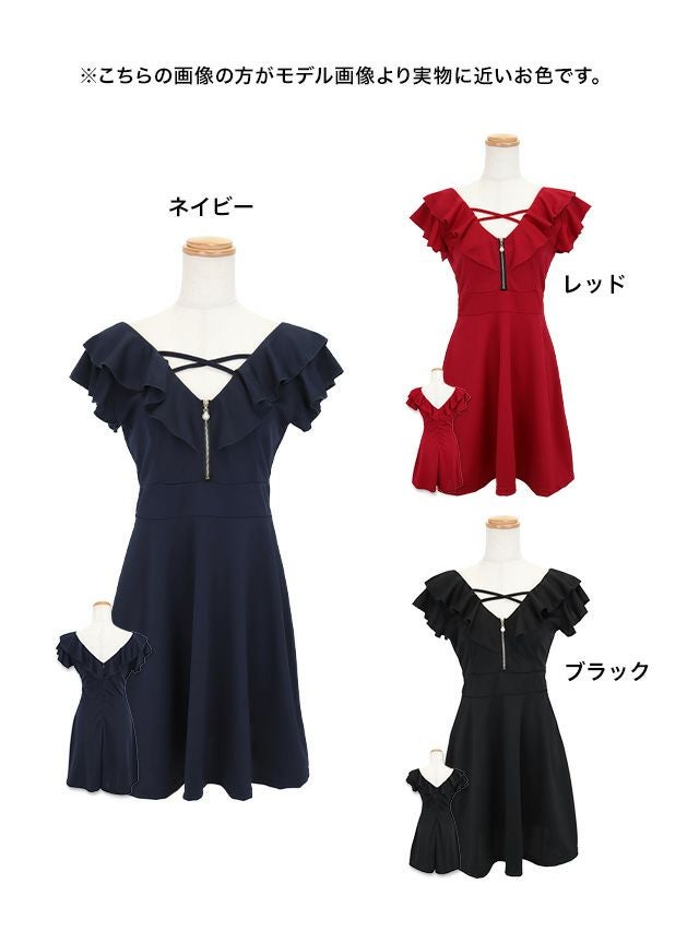 フリル袖バストクロスジップ半袖ハイウエスト切替フレアミニドレスのメイン画像