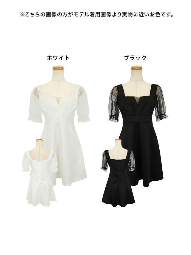 半袖シースルーパフスリーブハイウエスト切替フレアミニドレス