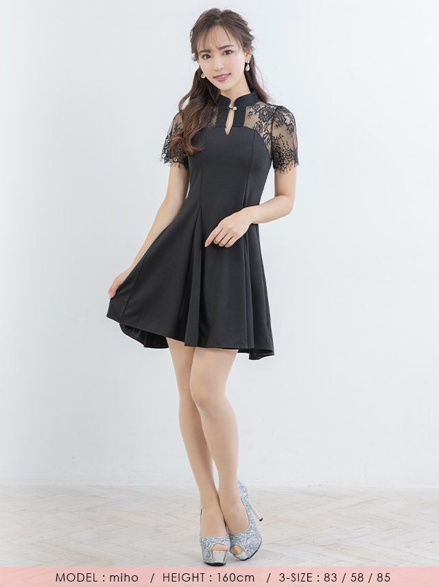シンプルなデザインのミニドレス ブラックレースデザイン半袖フレアミニドレス (中尾みほ着用)