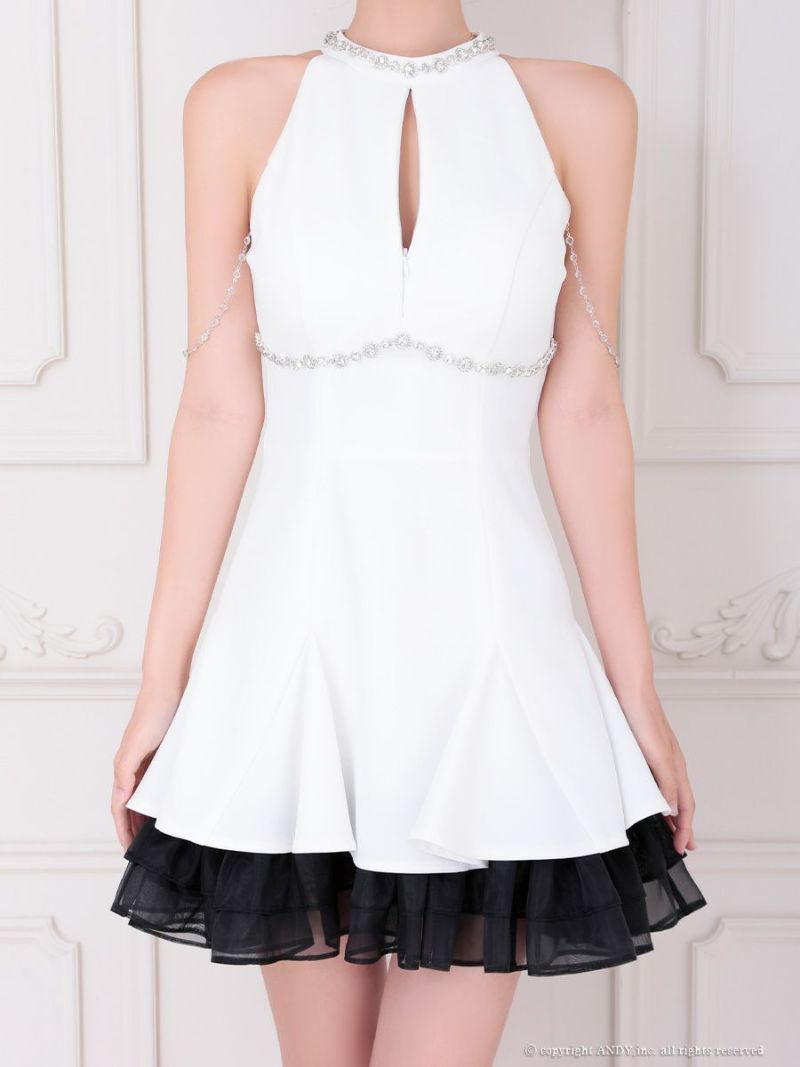 キャバドレス an アン 高級 Aライン ミニドレス 谷間 ホルターネック ジップ チュール 裾フリル ビジュー チェーン バストカット高級 Aライン ミニドレス 谷間 ホルターネック ジップ チュール 裾フリル ビジュー チェーン バストカット