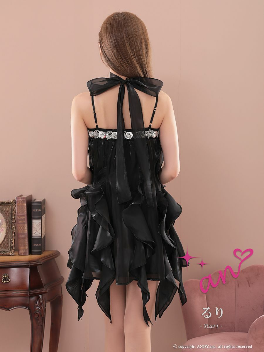 キャバドレス an アン 高級 ブランド フレアミニドレス キャミソール ネックリボン サテン フリル ジップ キュート