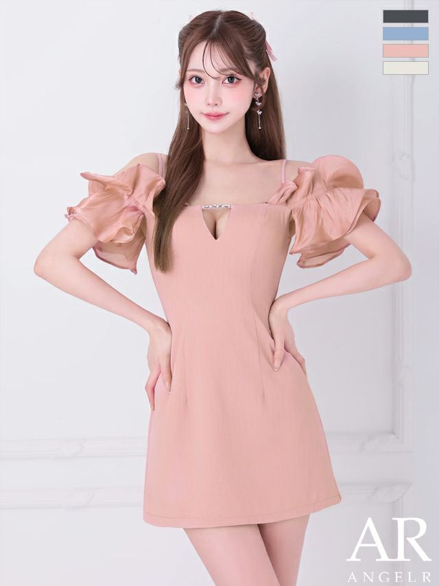 キャバドレス ミニドレス Angel-R エンジェルアール 高級 2way オフショルダー フリルスリーブ チャーム ワンカラー フレアミニドレス