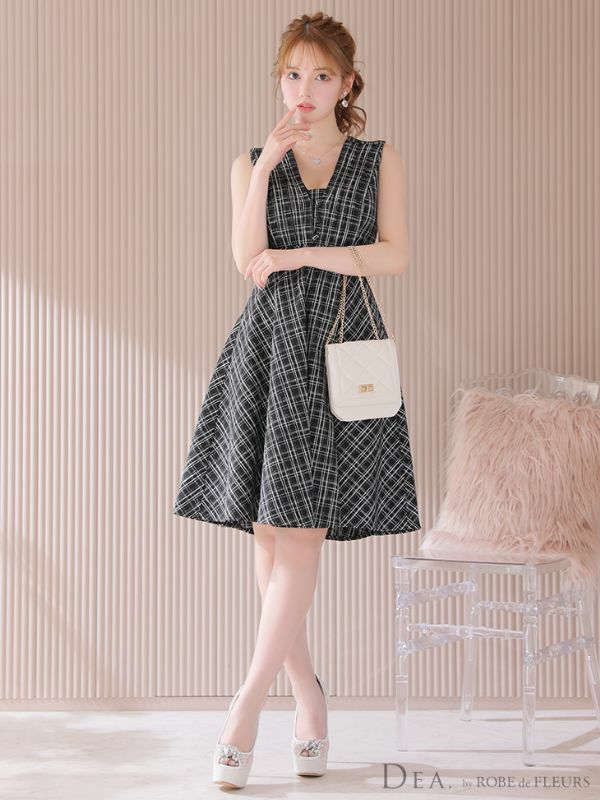 4. [DEA.byROBEdeFLEURS/ディアバイローブドフルール] 高級ノースリーブVネックチェック柄ツイードフレア膝丈ワンピースドレス