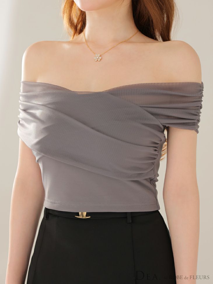 デコルテを綺麗に魅せるデザイン☆ [DEA.byROBEdeFLEURS/ディアバイローブドフルール] 高級 セットアップ ギャザー オフショルダー ウエストベルト チュール カジュアル フレアミニドレス