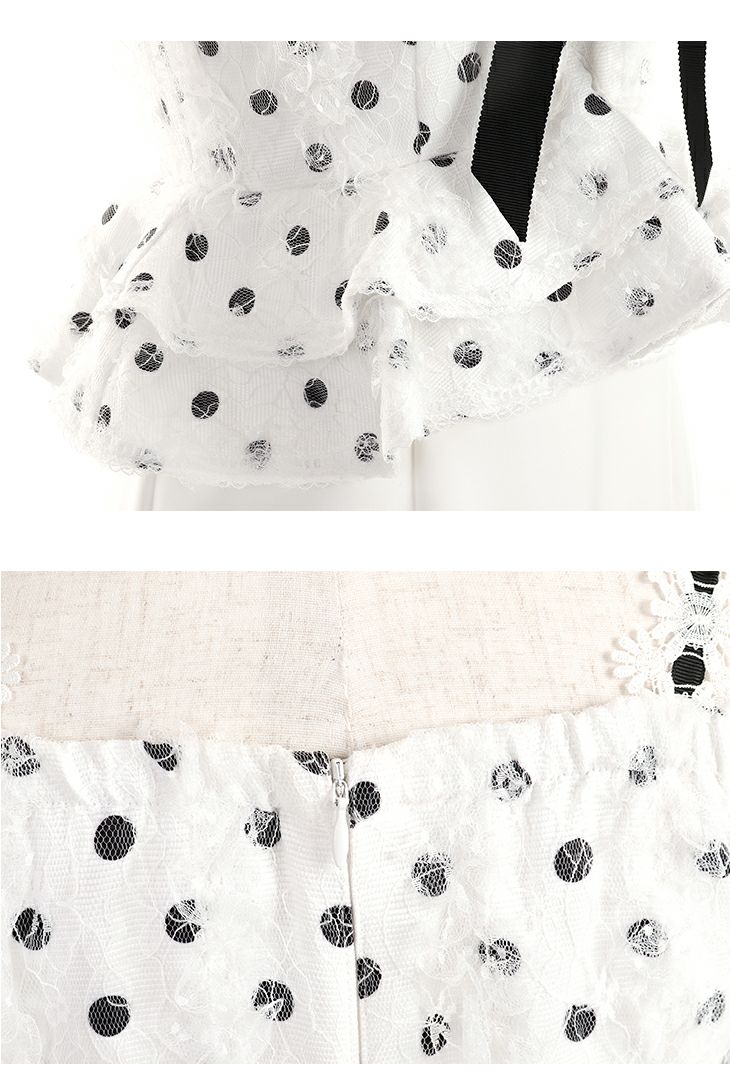 3. [ROBEdeFLEURS/ローブドフルール] 高級 胸元フリル モノトーン ドット柄 肩出し 二の腕カバー レーススリット タイトミニドレス