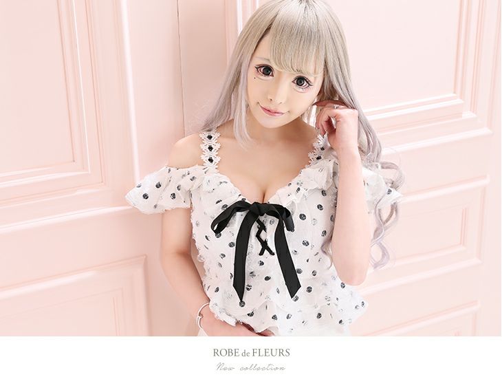 ROBEdeFLEURS ローブドフルール 高級胸元フリルモノトーンドット柄×肩あきタイトミニドレス