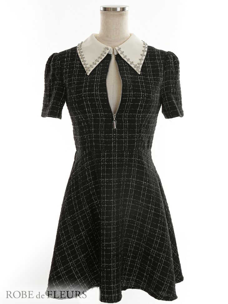 襟付きで上品見えドレス☆ [ROBEdeFLEURS/ローブドフルール] 高級 チェック柄 ビジュー襟付き ツイード バストジップ 半袖 ワンピース フレアミニドレス