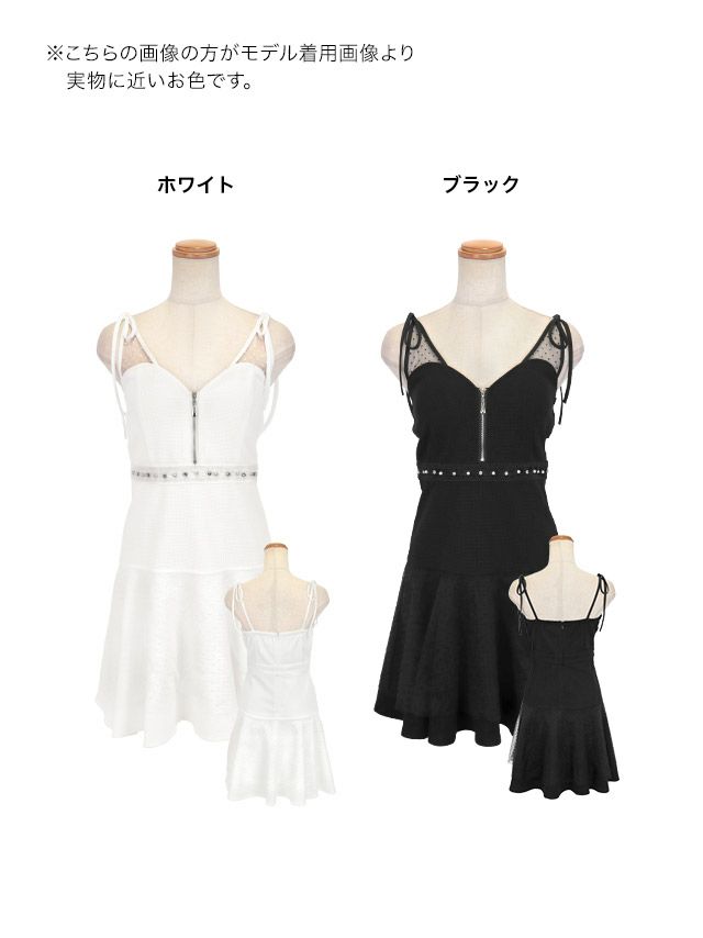 ドットシアーショルダーリボンキャミソールバストジップフレアミニドレスのカラーバリエーション