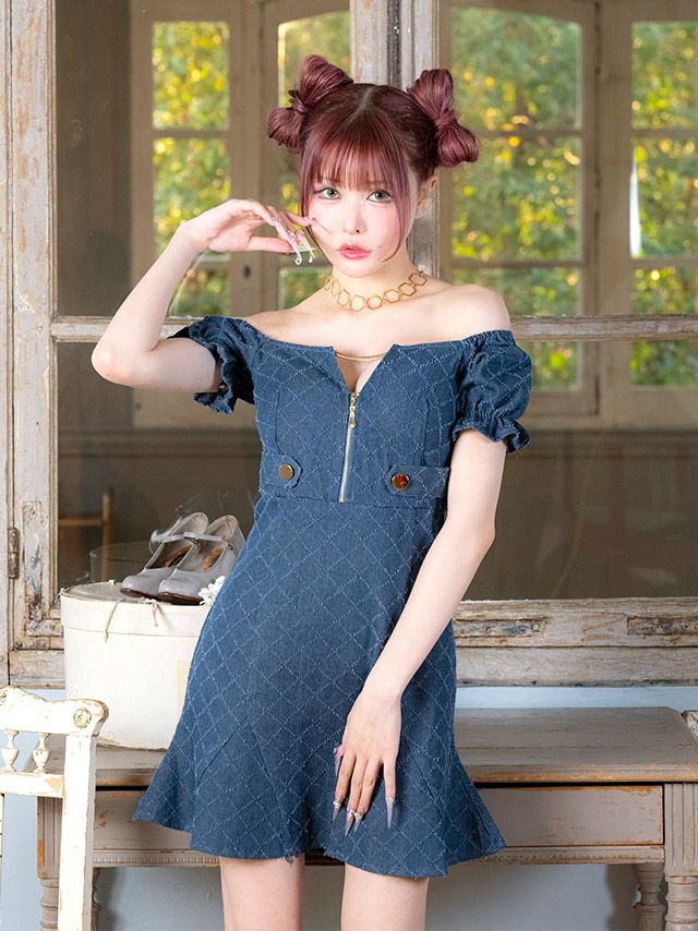 3. ワンピース Aライン ミニドレス 谷間 オフショルダー ジップ チェック柄 デニム パフスリーブ サイドベルト バストカット 同伴 キャバドレス (戦慄かなの着用)