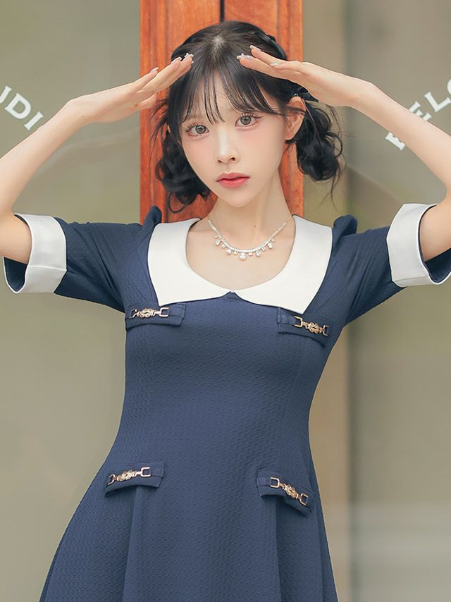5. [SALE] 韓国ドレス ワンピース 襟付き 袖あり バイカラー Aライン ミニドレス (緩苺着用) [tk-mdk5001]