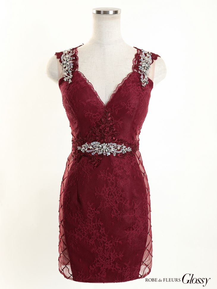 高級感溢れるビジューが煌びやかな一枚☆ [ROBEdeFLEURSGlossy/ローブドフルールグロッシー] 高級くびれブロックチュール切替ノースリーブビジュータイトミニドレス