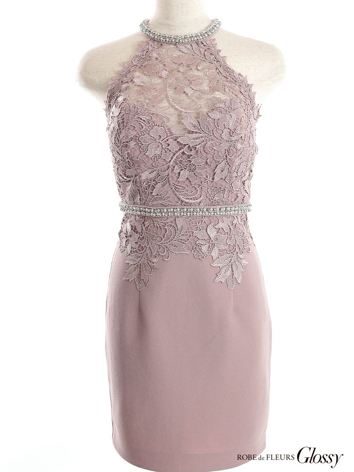 レースから覗く谷間に誰もが目を奪われる☆ [ROBEdeFLEURSGlossy/ローブドフルールグロッシー] 高級レースビジューホルターネックウエスト切り替えタイトミニドレス