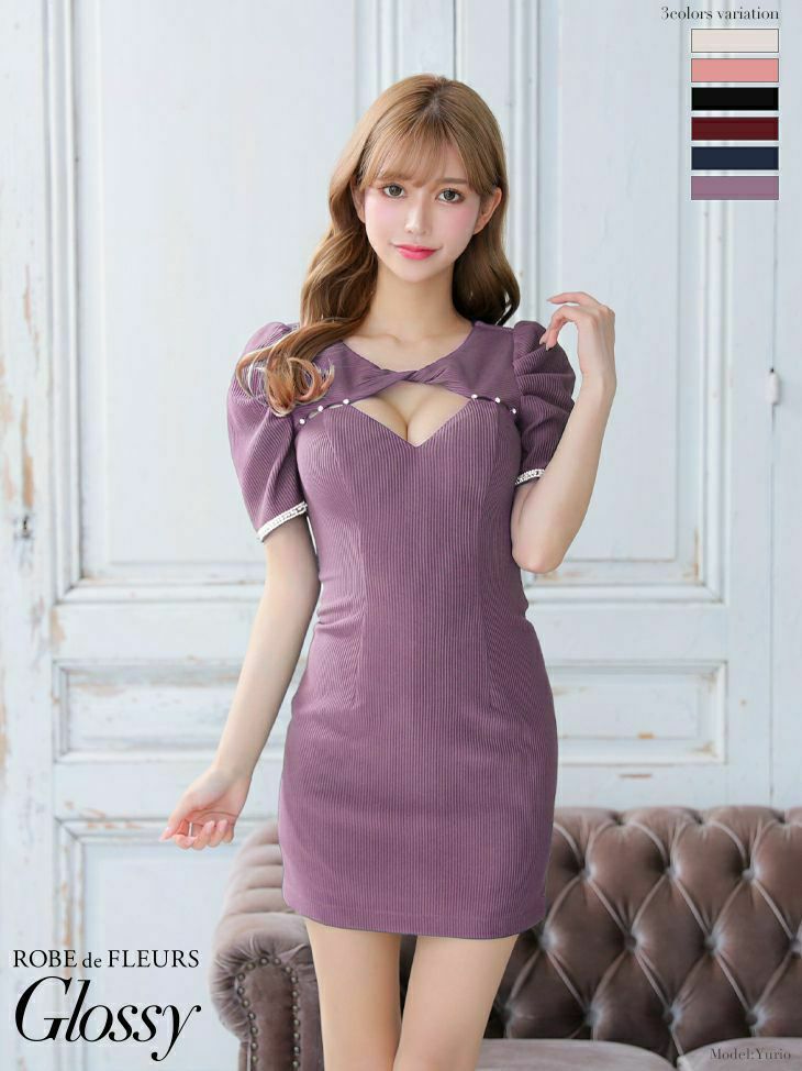 5. [ROBEdeFLEURSGlossy/ローブドフルールグロッシー] 高級 パフスリーブ バストカット パールビジュー ワンカラー 半袖 谷間魅せ タイトミニドレス