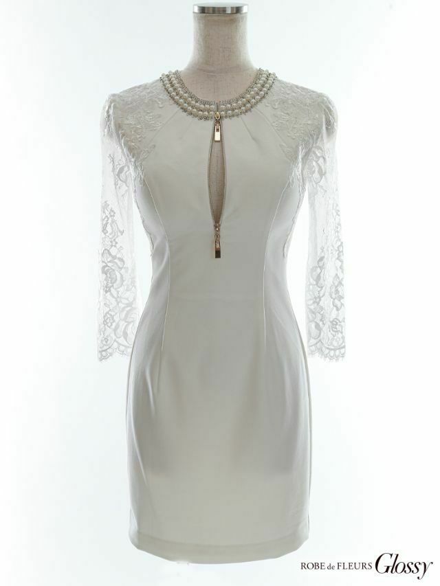 4. [ROBEdeFLEURSGlossy/ローブドフルールグロッシー] 高級パールネックバストジップスリーブレース袖ありタイトミニドレス