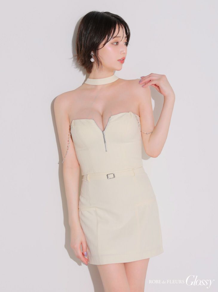 キャバドレス ミニドレス ROBEdeFLEURSGlossy ローブドフルールグロッシー 高級 ベアトップ セットアップ ジップ ウエストベルト チョーカーデザイン チェーン タイトミニドレス