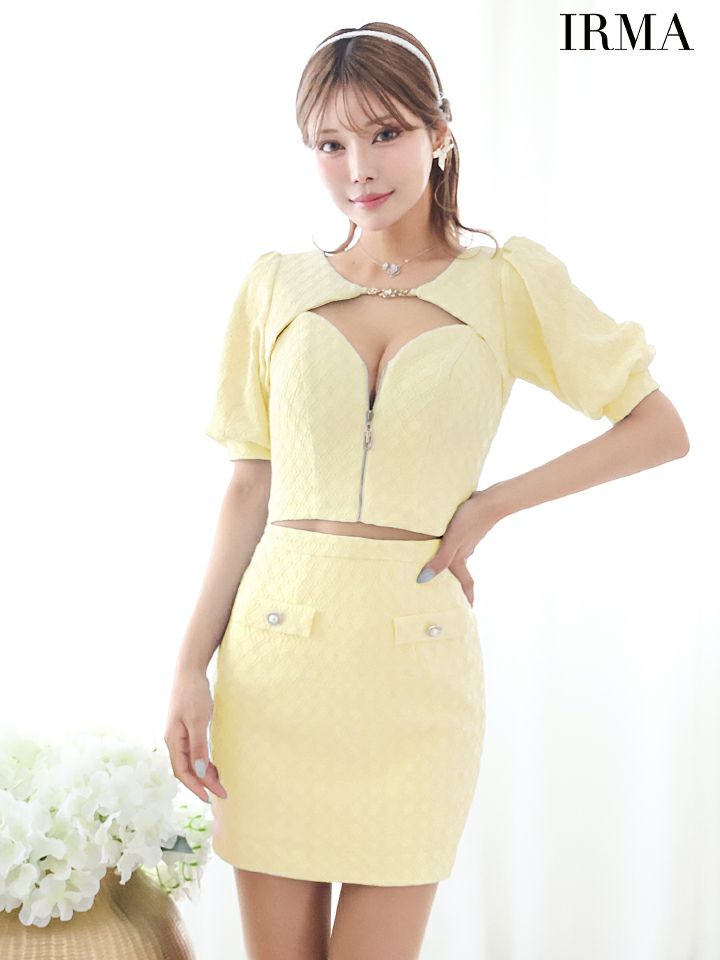 バストカットでsexyに魅せる☆ [IRMA/イルマ] 高級 半袖 柄織りニット セットアップ バストカット フェイクポケット パールボタン ジップ タイトミニドレス