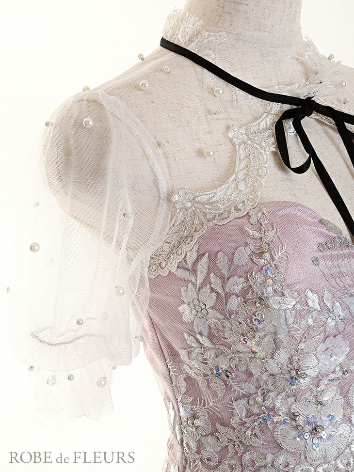 パールチュール×フラワーレースで上品☆ [ROBEdeFLEURS/ローブドフルール] 高級ネックリボンパールスリーブ×フラワーレースタイトミニドレス