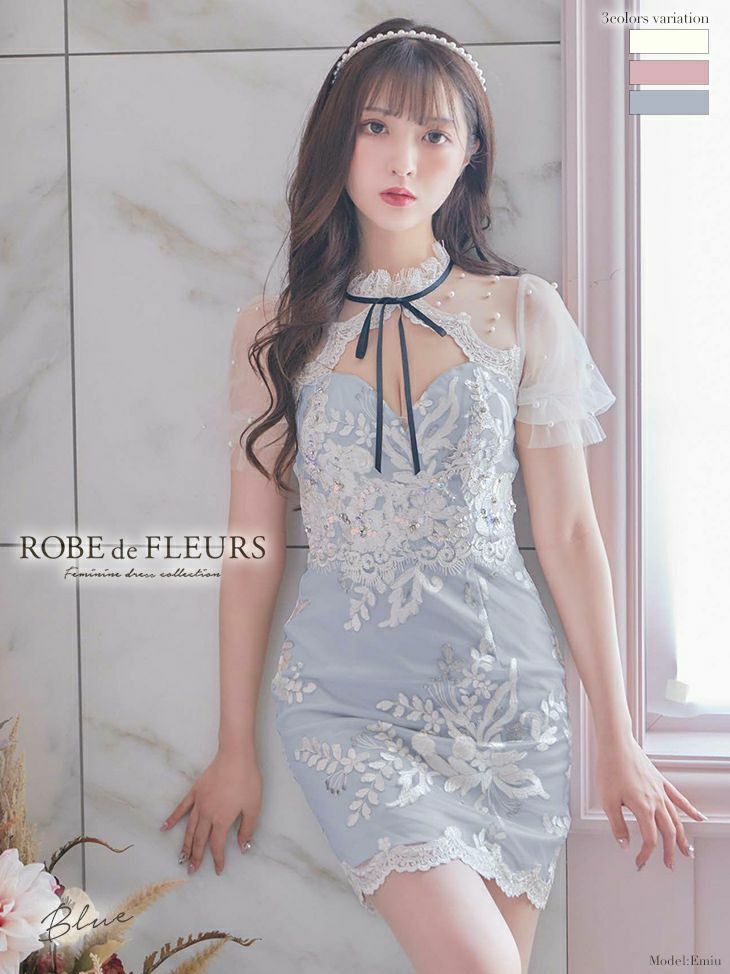 可愛さとセクシーさを兼ね備えたドレス☆ [ROBEdeFLEURS/ローブドフルール] 高級ネックリボンパールスリーブ×フラワーレースタイトミニドレス