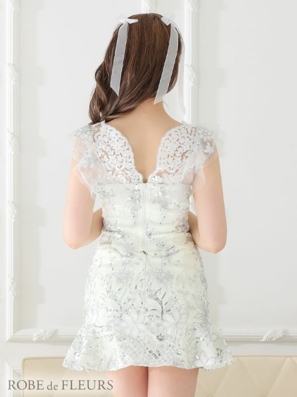 胸元のビジュー×レースが目を惹く☆ [ROBEdeFLEURS/ローブドフルール] 高級フロントクロスフラワーレースフリル袖セットアップドレス
