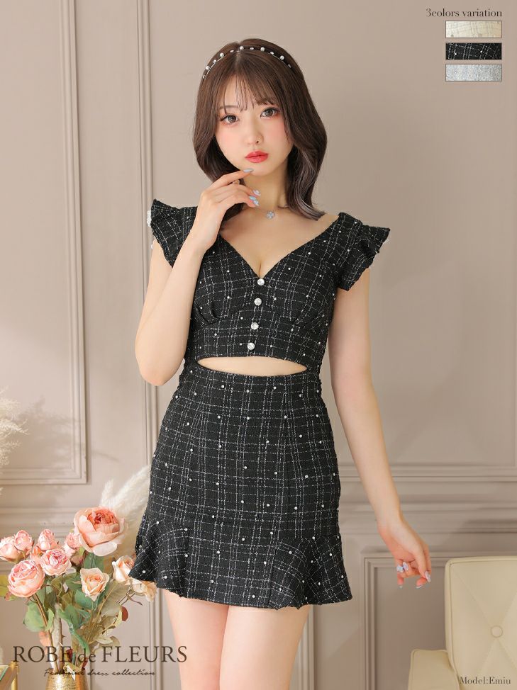 ラメツイードとフリルがガーリー☆ [ROBEdeFLEURS/ローブドフルール] 高級ラメツイードリボンフリルスリーブタイトミニドレス