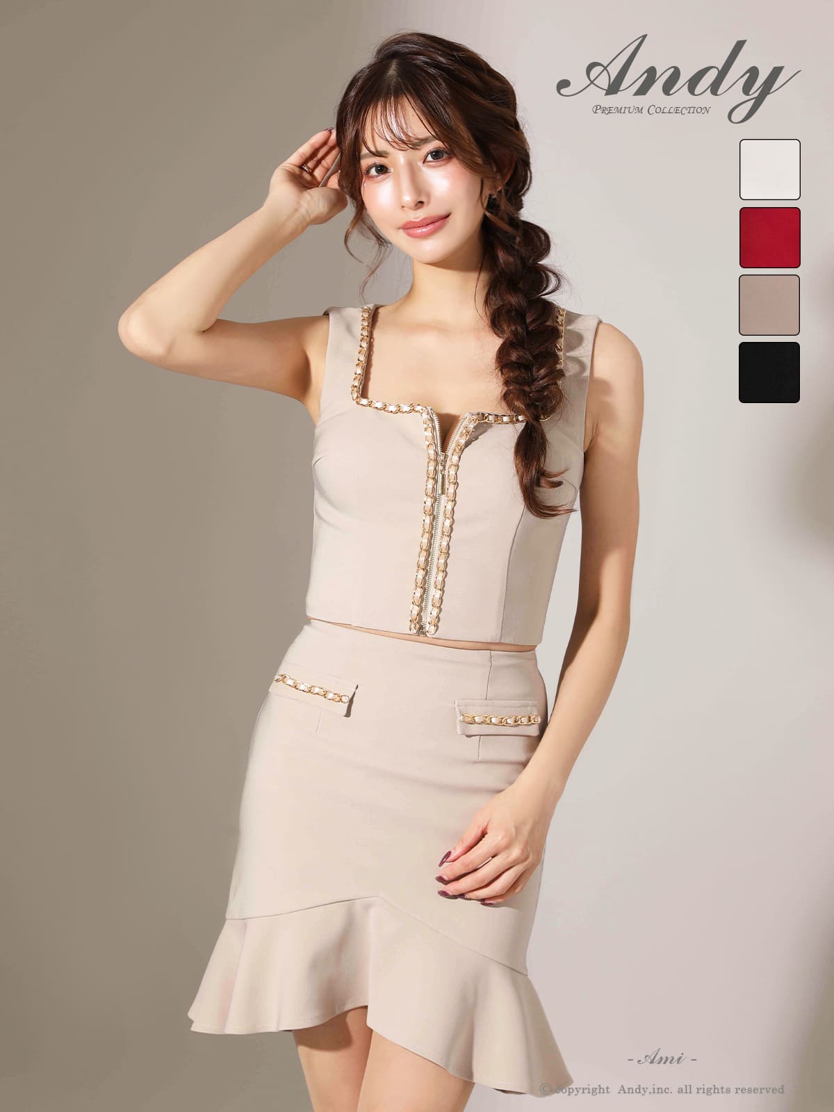 他の画像を見る ワンカラーのセットアップ☆ [Andy/アンディ] 高級 ブランド タイトミニドレス ノースリーブ バストカット ジップ 裾フリル チェーン セットアップ ¥ 28,600 税込 在庫切れ お気に入りに追加