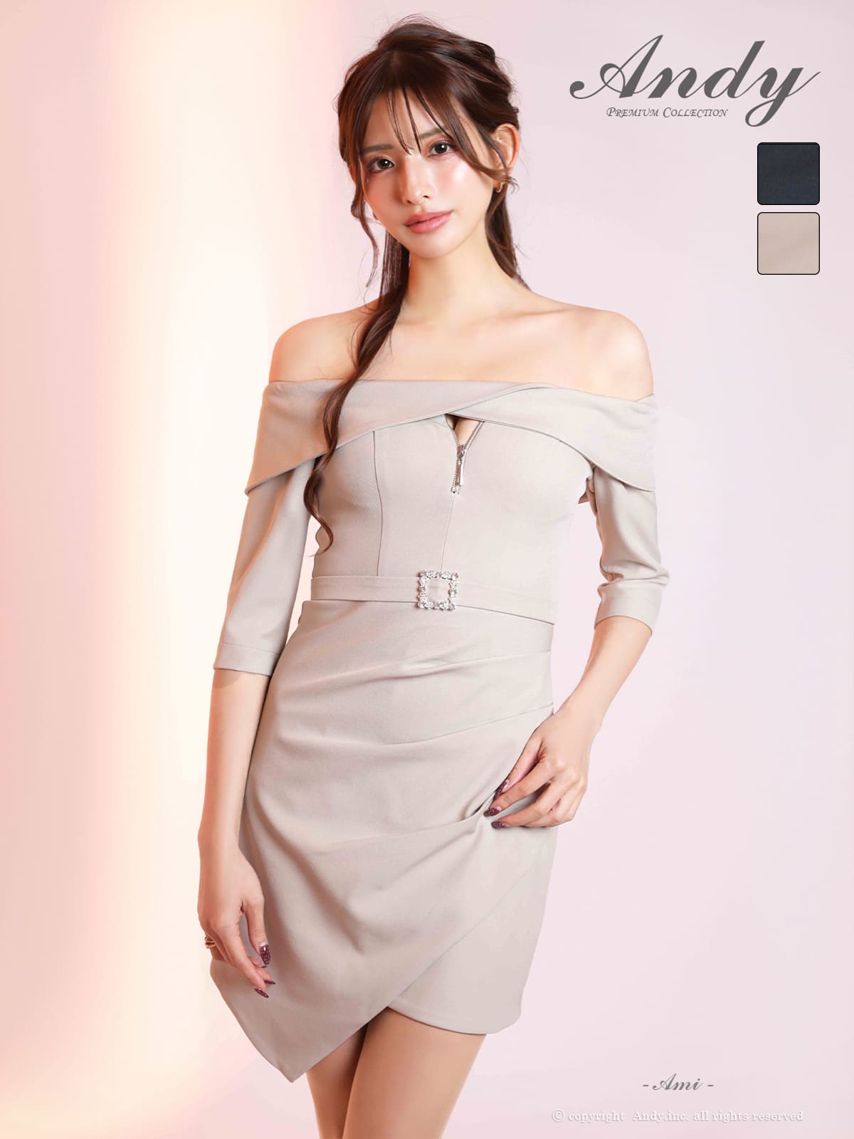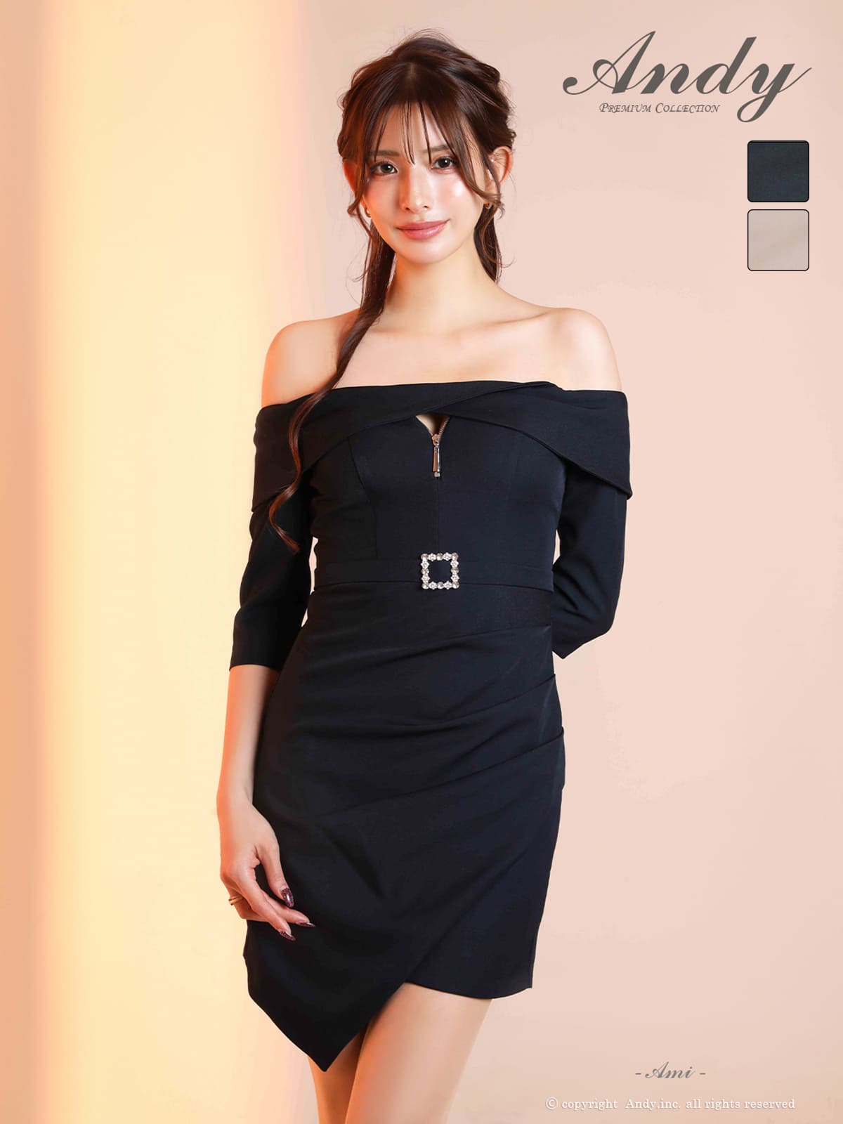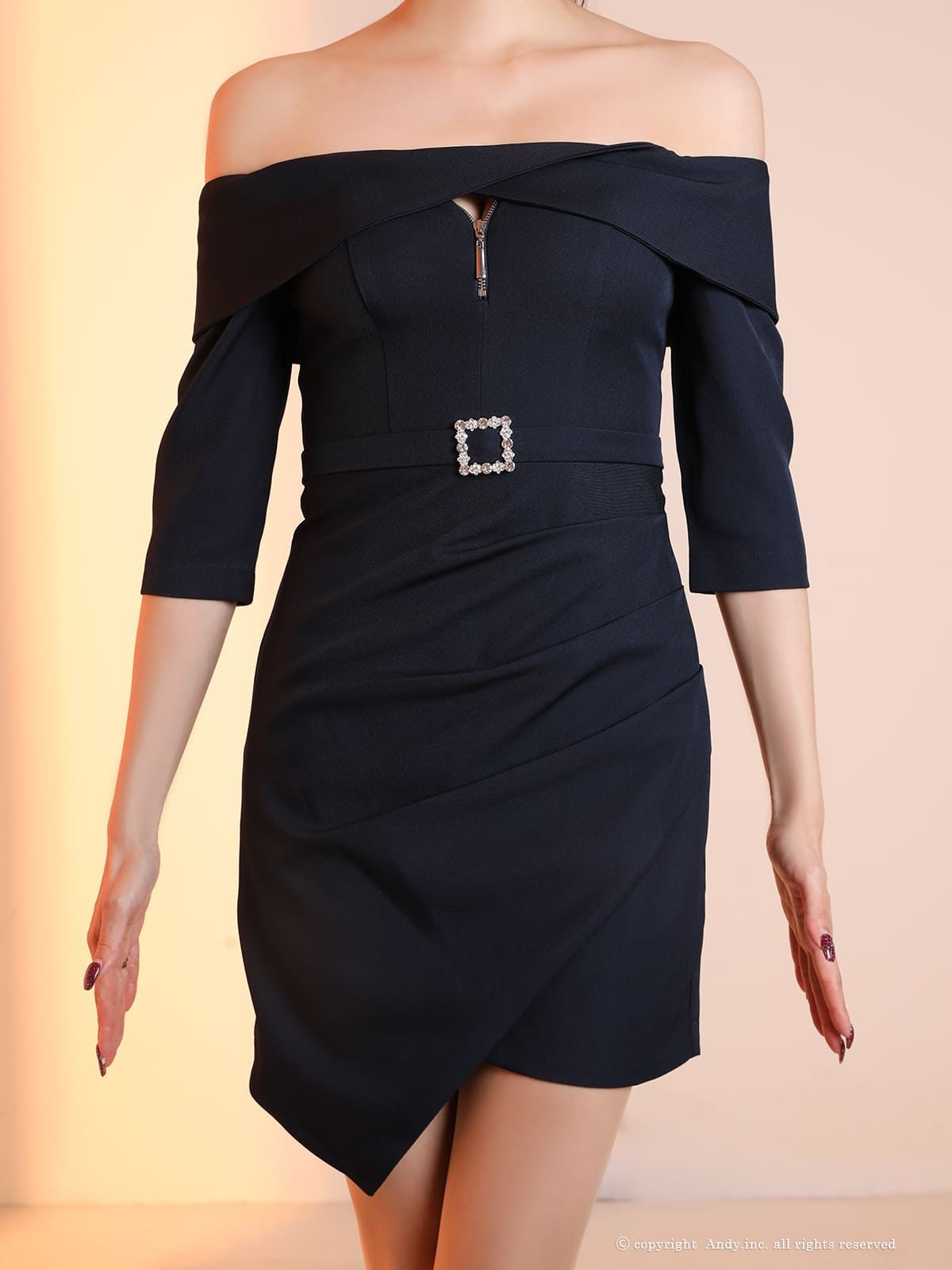 他の画像を見る ワンカラーの洗練された美しさ☆ [Andy/アンディ] 高級 ブランド タイトミニドレス オフショルダー バストカット ジップ 裾フリル ウエストベルト 袖あり ¥ 25,300 税込 在庫切れ お気に入りに追加