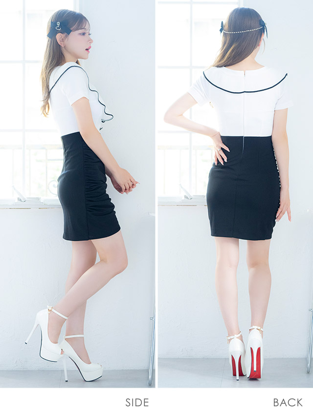 5. [韓国ドレス] ミニドレス パイピングフリル 襟付き ウエスト切替 ラップギャザー タイト キャバドレス (黒崎みさ着用) [tk-mdk141]