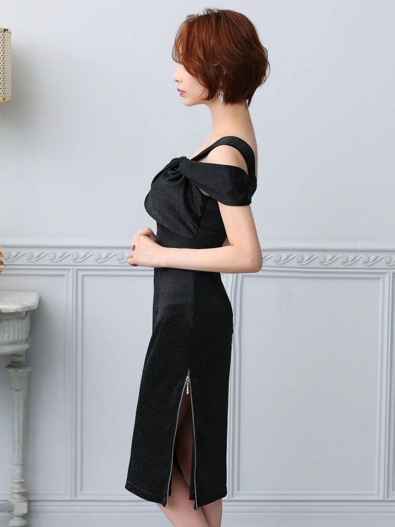 3. [Veautt/ヴュート] 高級 ワンショルダー ラメ ワンカラー ファスナースリット タイト 膝丈ドレス