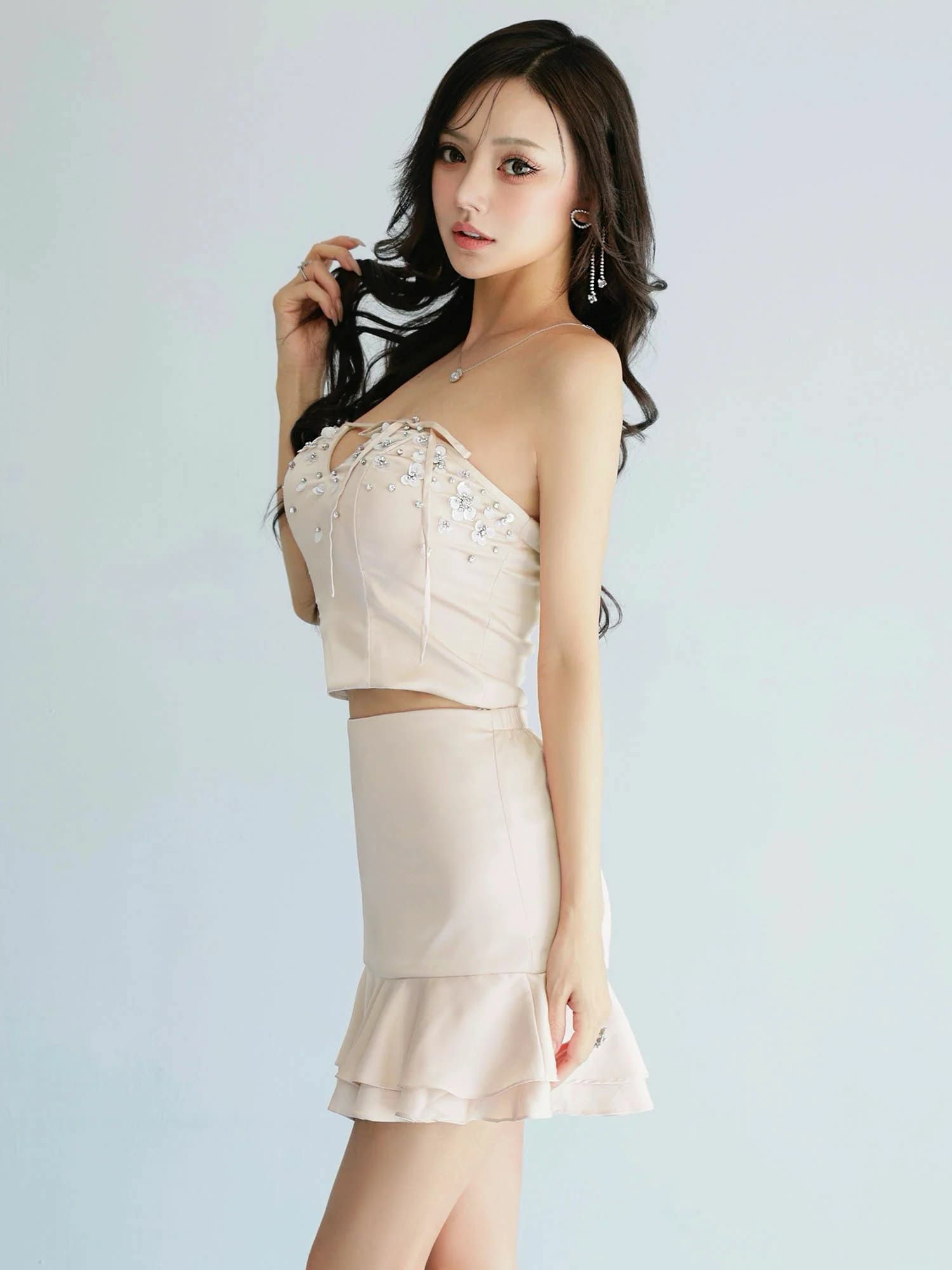 色気溢れるバストラインをメイク♡ 予約商品【4月上旬入荷予定】[Angel-R/エンジェルアール] 高級 ブランド フレアミニドレス 谷間 セットアップ ベア キャミソール 2way ジップ ハートカット フリル ワンカラー