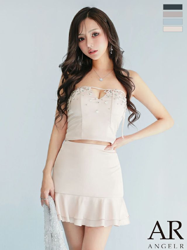 気分でベアトップとしても着られる♡ 予約商品【4月上旬入荷予定】[Angel-R/エンジェルアール] 高級 ブランド フレアミニドレス 谷間 セットアップ ベア キャミソール 2way ジップ ハートカット フリル ワンカラー