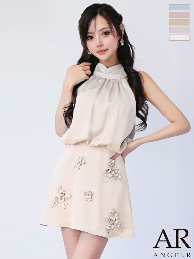 煌めく立体フラワーがCUTE♡ 予約商品【4月上旬入荷予定】[Angel-R/エンジェルアール] 高級 ブランド フレアミニドレス セットアップ クロスホルターネック 立体フラワー シフォン バイカラー 胸元カバー