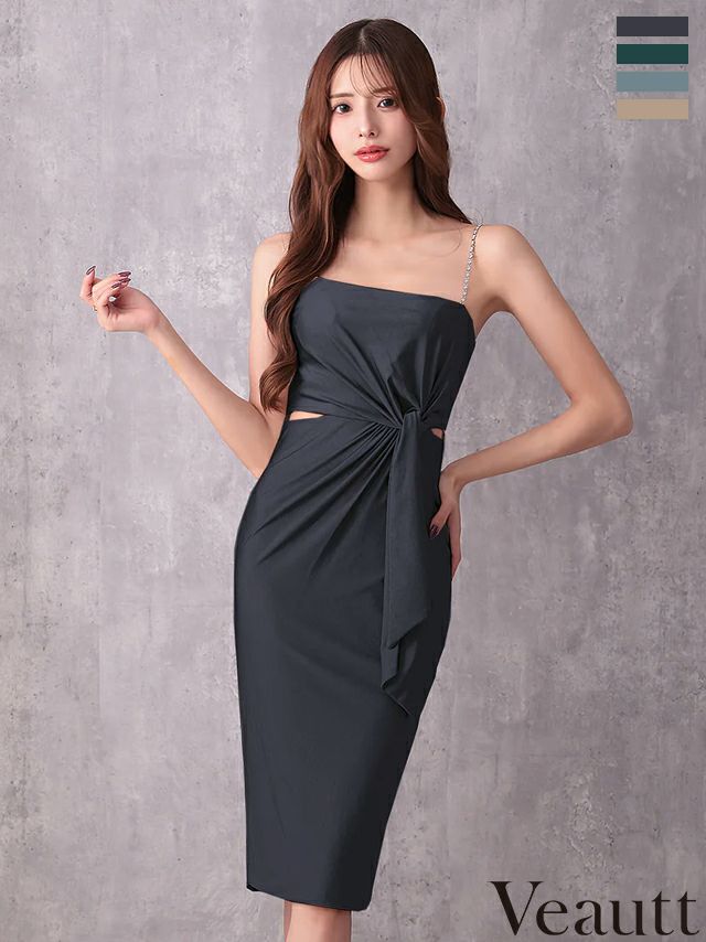 ワンカラーで大人っぽさを格上げ♡ 予約商品【4月中旬入荷予定】[Veautt/ヴュート] 高級 ブランド タイト膝丈ドレス ホルターネック ギャザートップ ウエストタックデザイン ネックチェーン 胸元カバー ビジュー (伊藤舞雪着用)