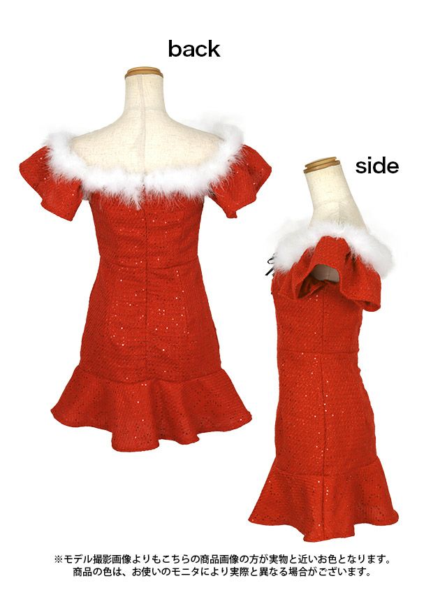 4. サンタコスプレ 2点set オフショルバストレースアップツイードふわふわラメ猫アニマルドレス [ワンピース+サンタ帽]