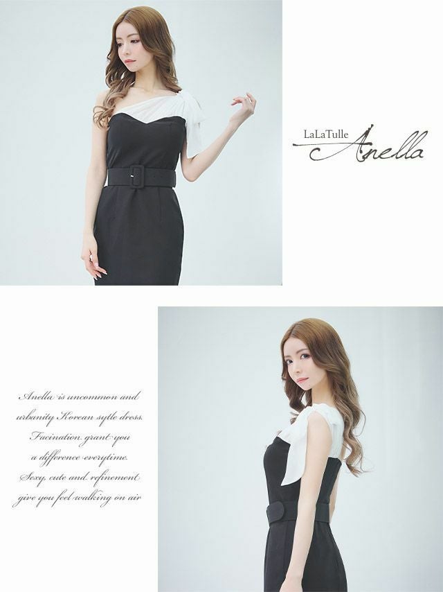 Anella アネラ ワンショルダーウエストベルト膝丈タイト韓国ドレス (Sサイズ~Lサイズ) (森咲智美 キャバ韓国ドレス着用)