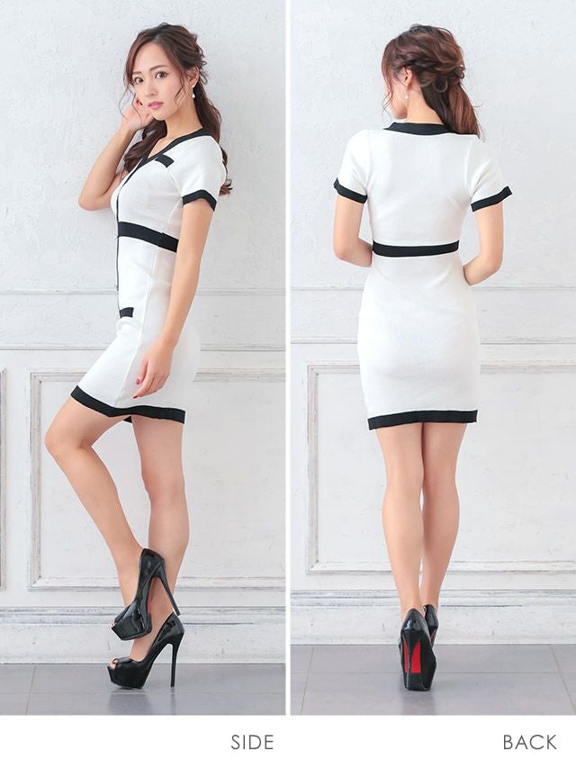 4. ミニドレス 半袖 ニット ブラジャーのまま バイカラー ストレッチ 同伴 安い プチプラ 胸元カバー タイト キャバドレス (中尾みほ着用) [th-md2195a]