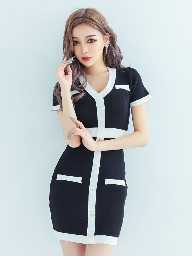 5. ミニドレス 半袖 ニット ブラジャーのまま バイカラー ストレッチ 同伴 安い プチプラ 胸元カバー タイト キャバドレス (中尾みほ着用) [th-md2195a]