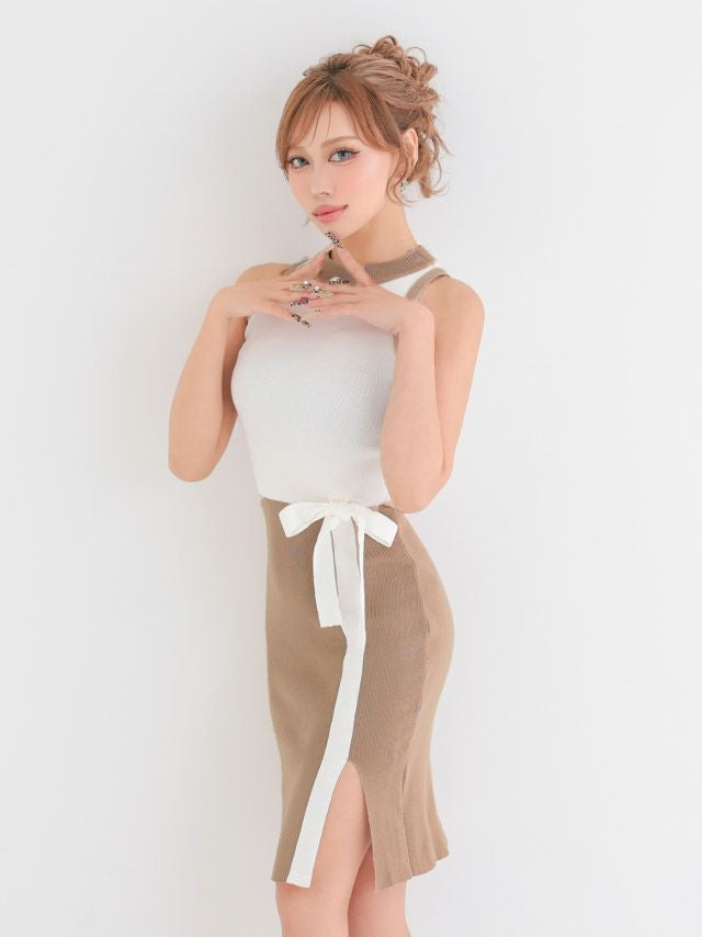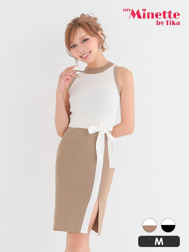 リボンで甘さプラス♪ ミニドレス ノースリーブ ニット ストレッチ 同伴 バイカラー シンプル 安い プチプラ タイト 胸元カバー キャバドレス (きぃぃりぷ着用) [th-mdtc2059]